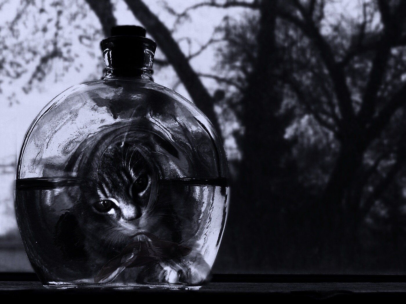 «Кот наблюдает за рыбкой в бутылке»