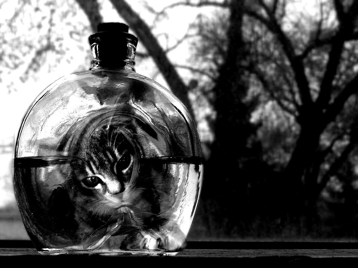 «Кот наблюдает за рыбкой в бутылке»