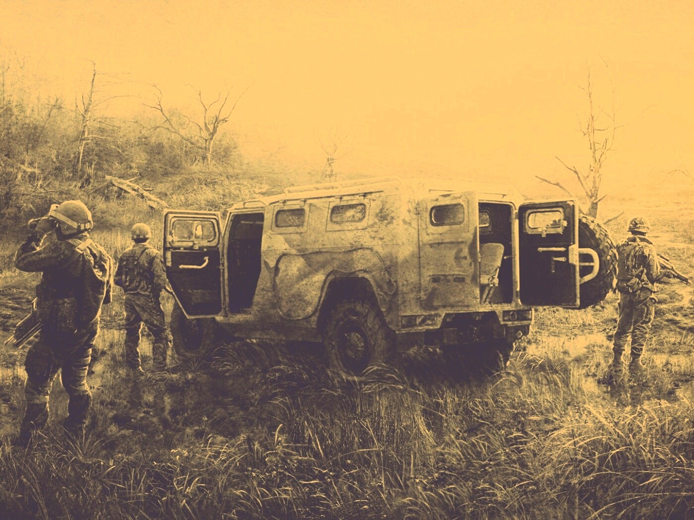 «Солдаты из сталкера на болоте»
