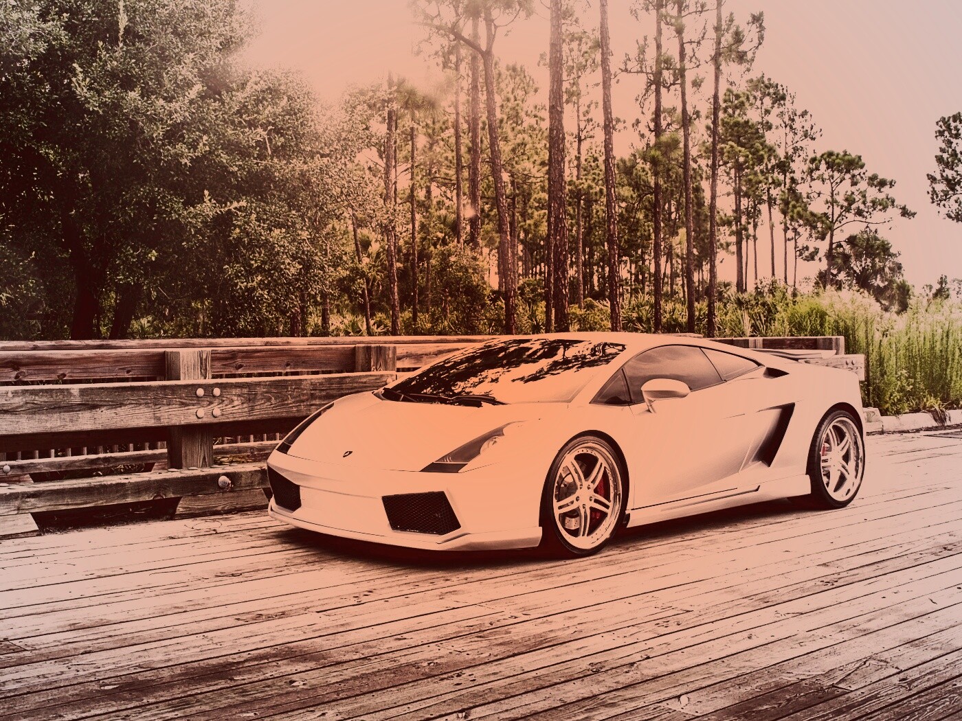 Обои для рабочего стола «Ламбоджини на мосту в лесу» 1400х1050 с фильтром toaster (оригинал 4064х2540)