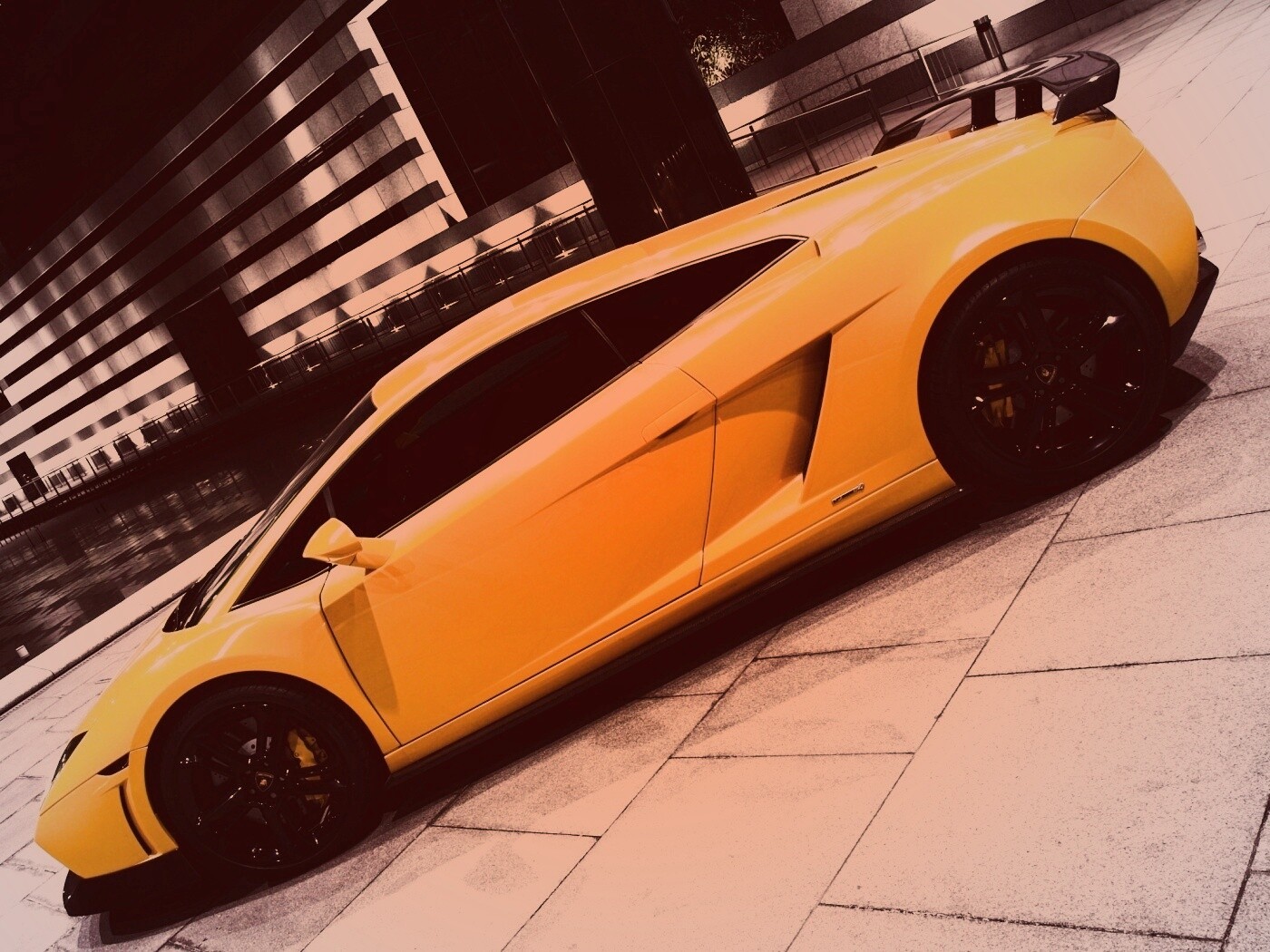 Обои для рабочего стола «Желтая ламборджини в автосалоне» 1400х1050 с фильтром toaster (оригинал 2560х1600)