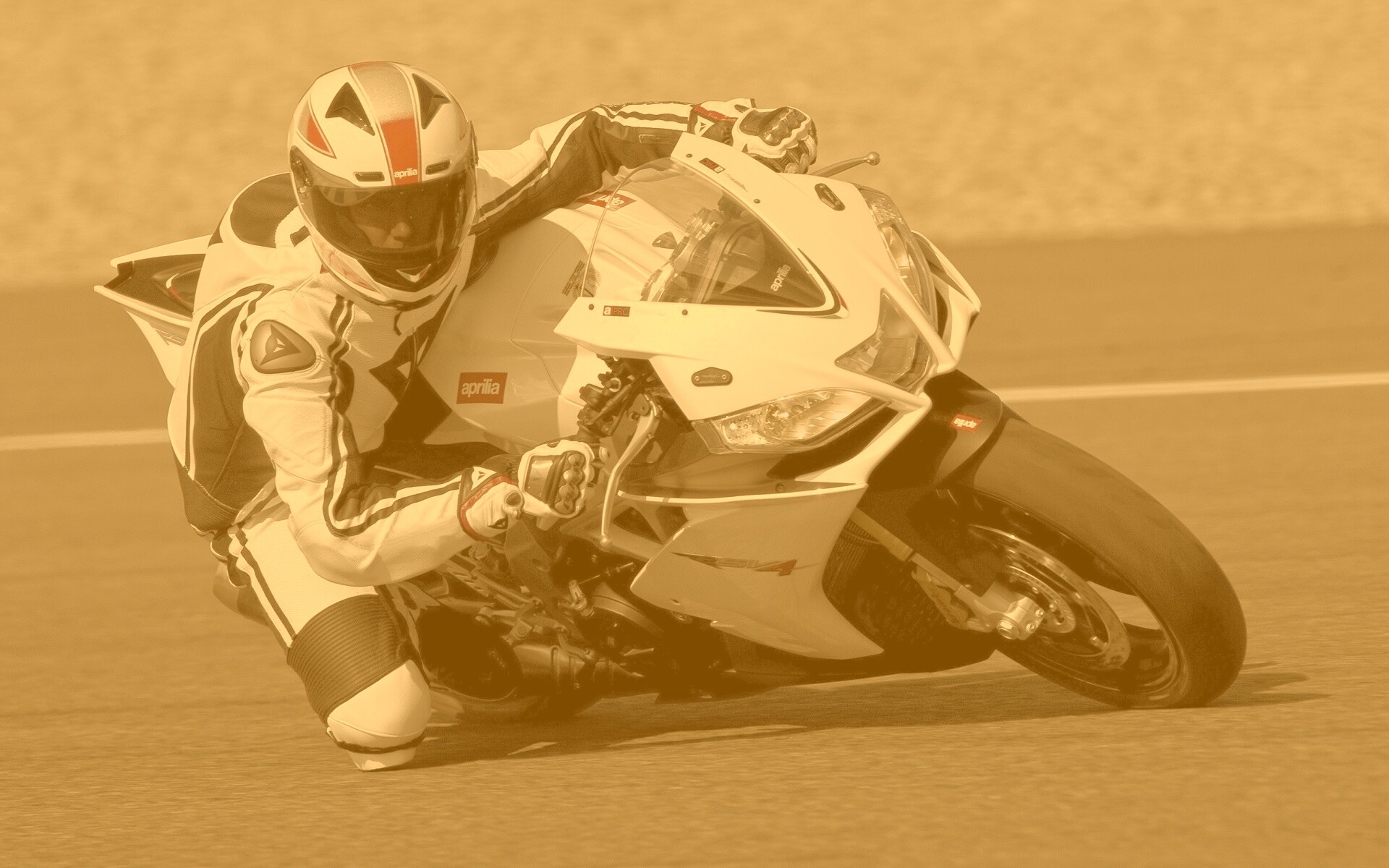 «Байкер в белой экиперовкена Априлия РСВ4»