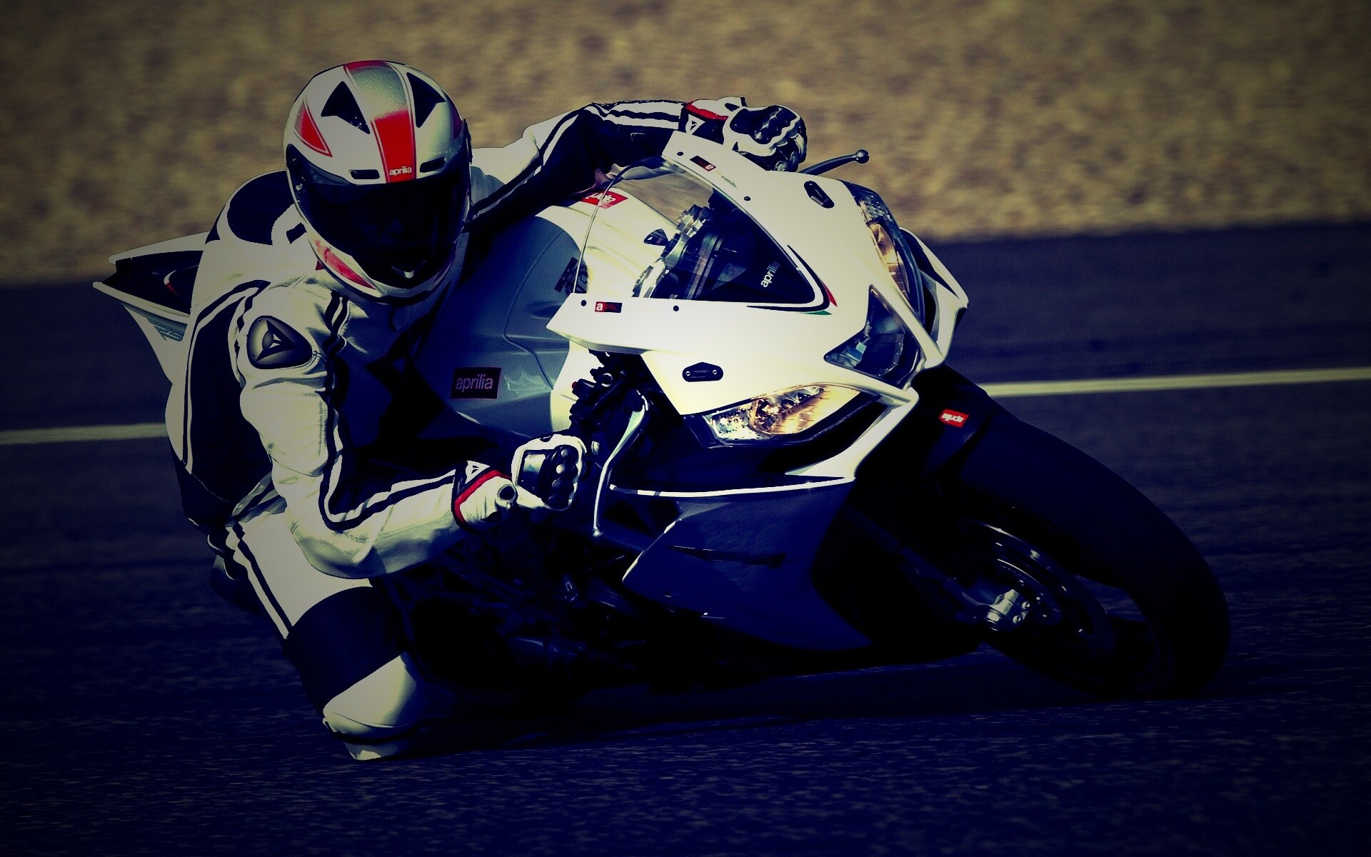 «Байкер в белой экиперовкена Априлия РСВ4»