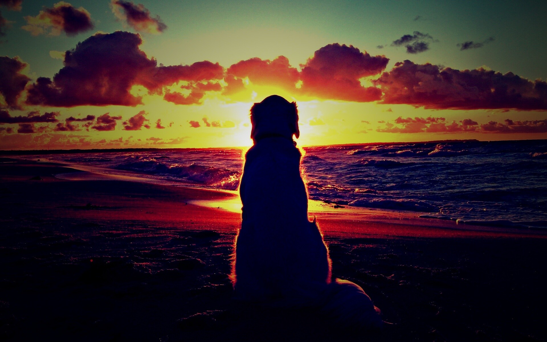 «Собака наблюдающая закат на пляже»