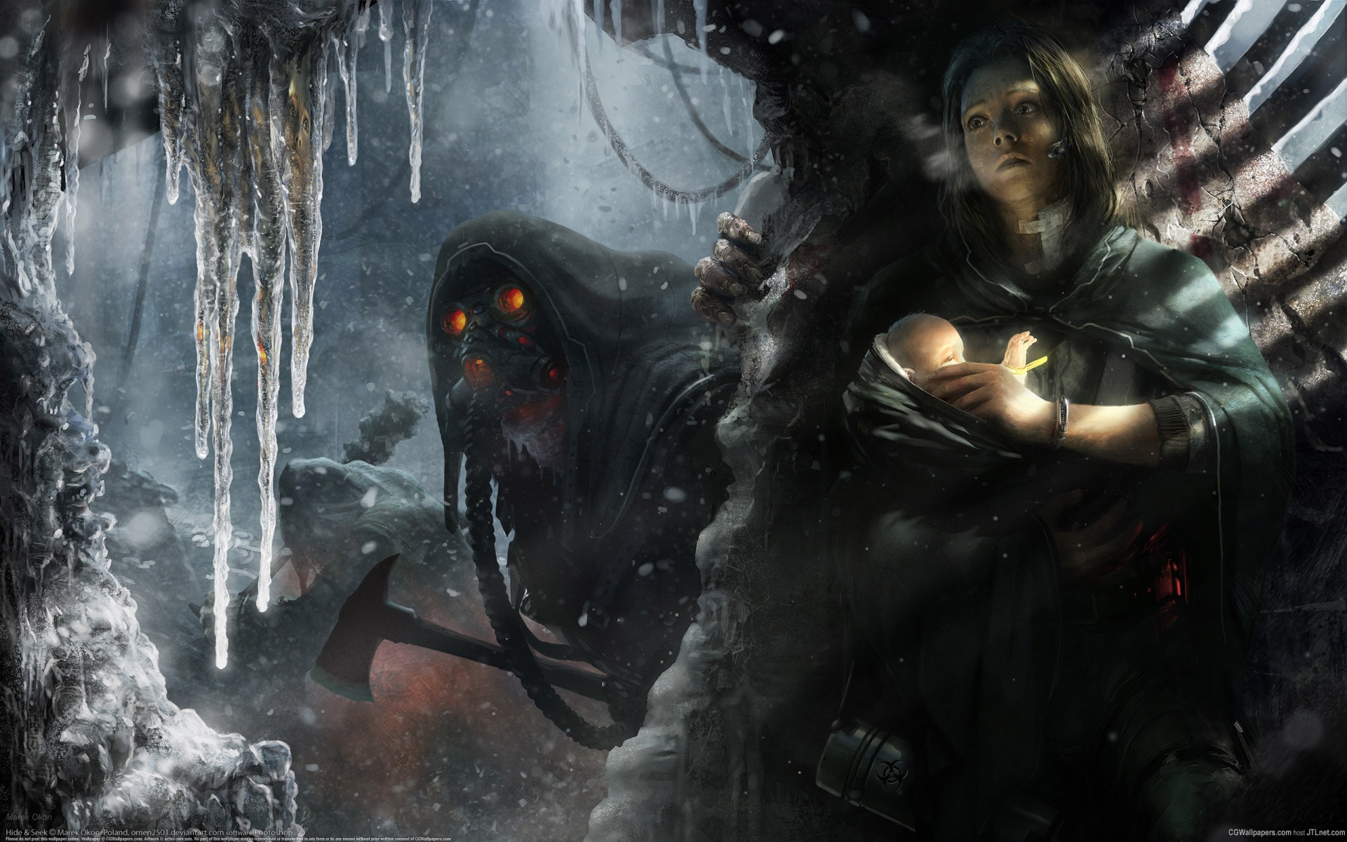 «Девушка с ребенком прячется от монстра»