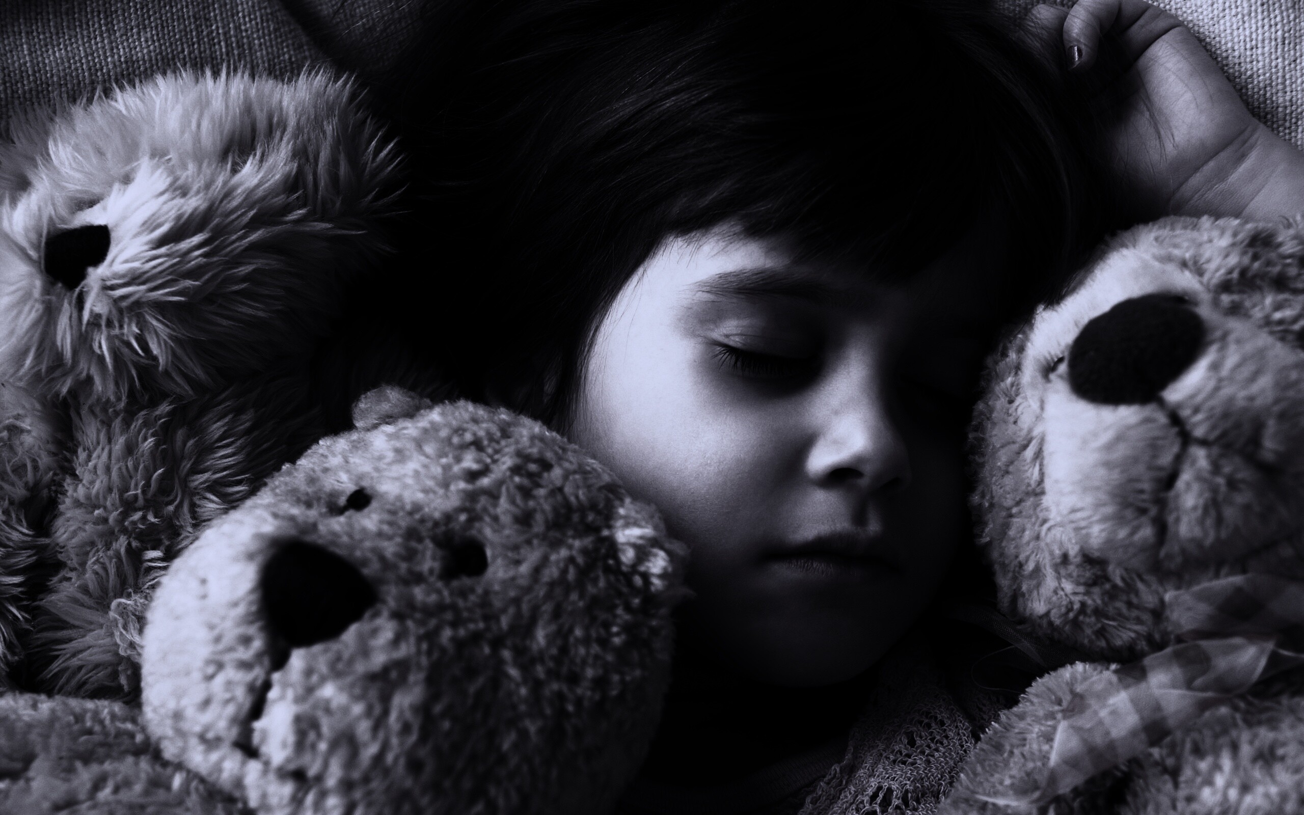 Обои для рабочего стола «Девочка спит с мишками в обнимку» 2560х1600 с фильтром gotham (оригинал 2560х1600)