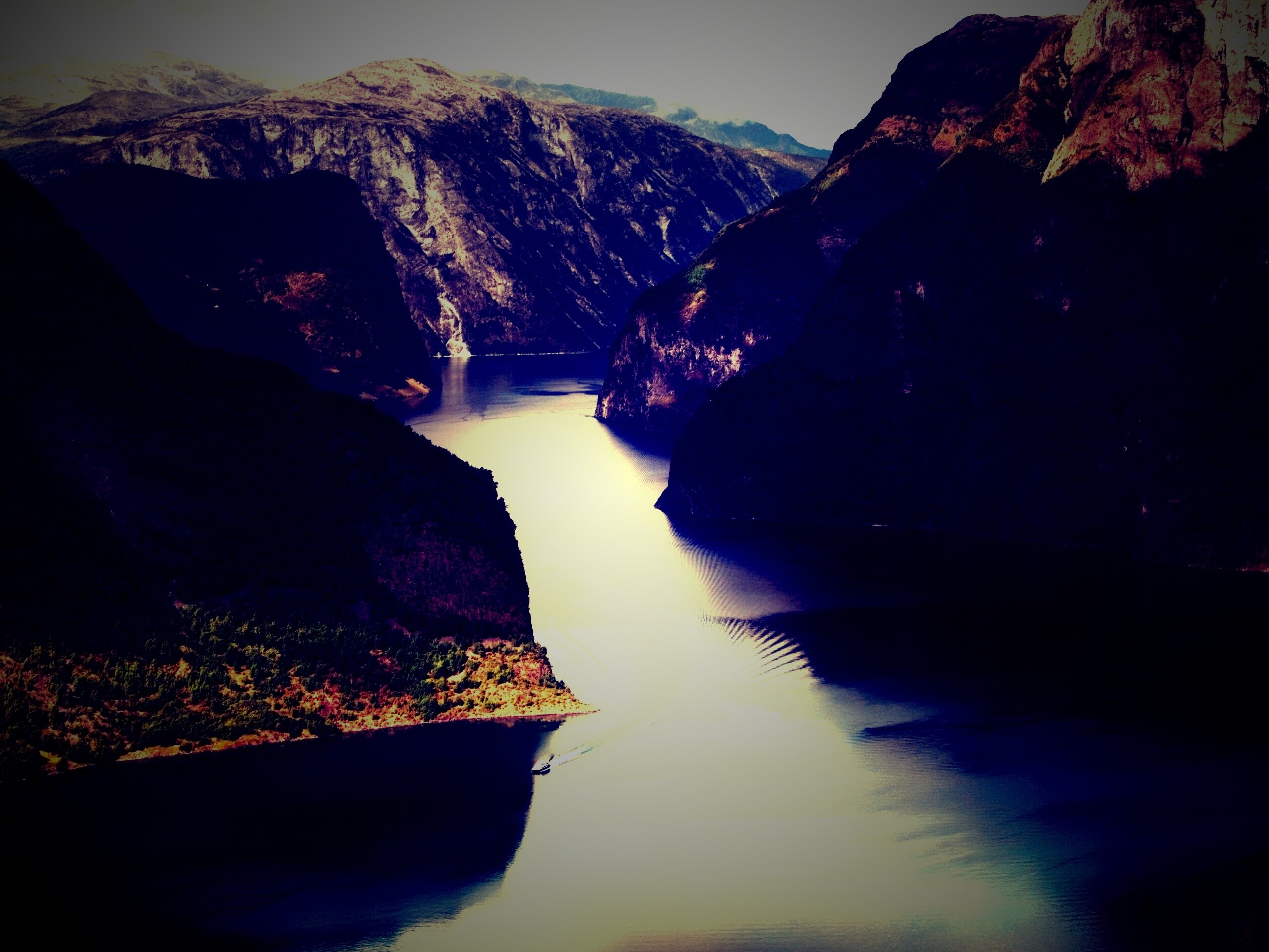«Лодка на реке среди высоких гор»