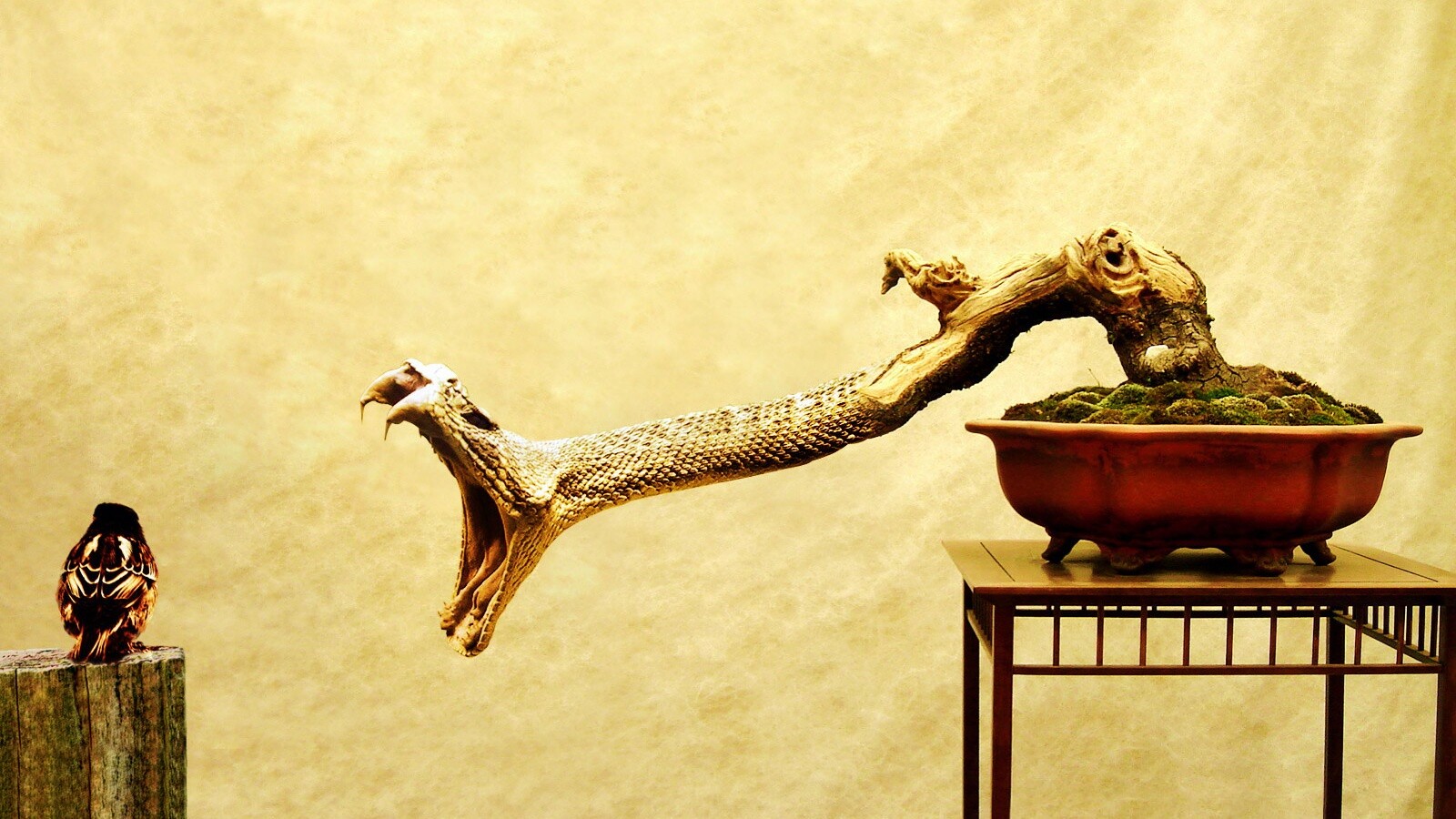 «Змея-коряга напдает на птичку»